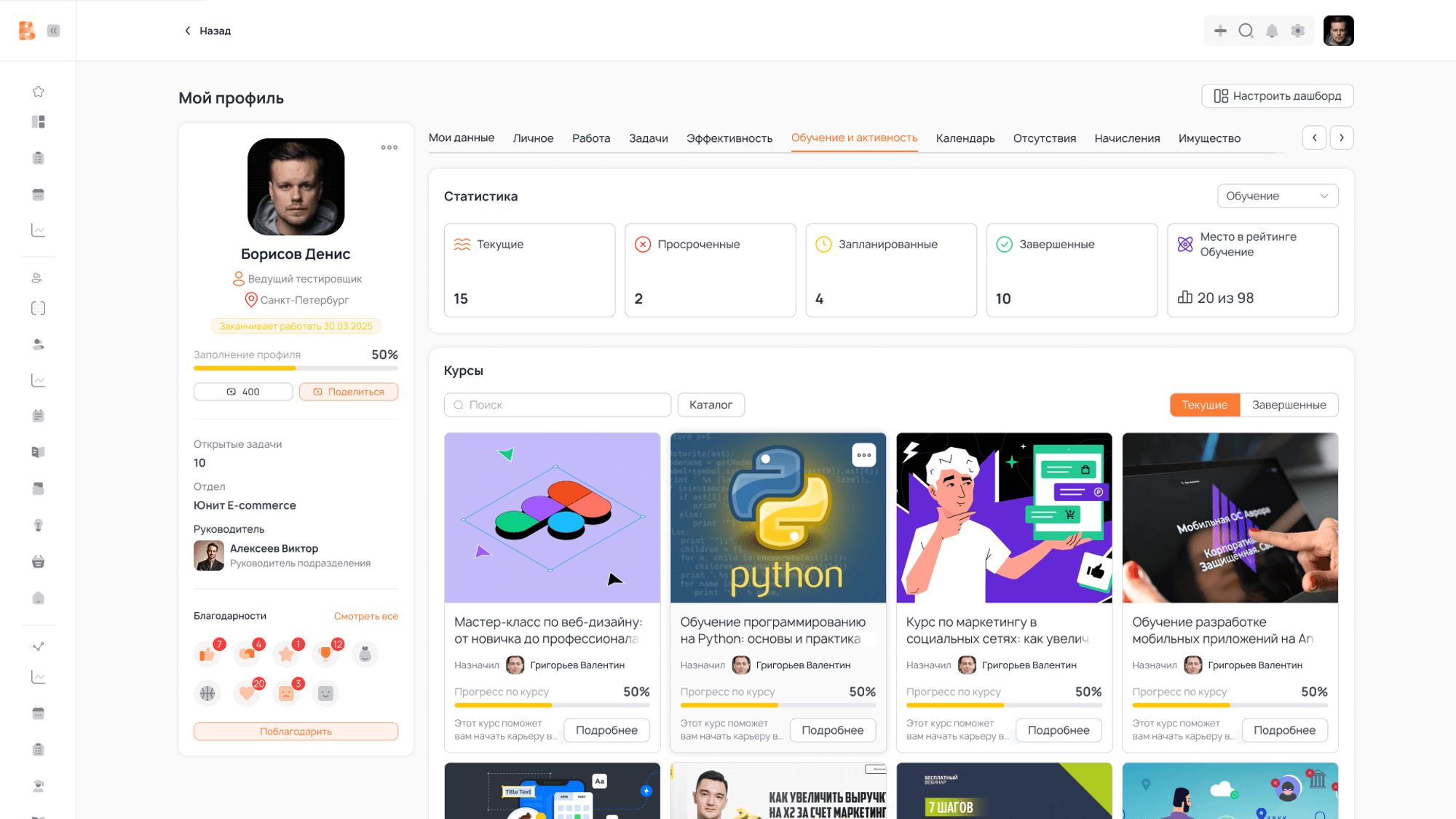 Сотрудники будут более мотивированы проходить курсы и выполнять задания, если они смогут наблюдать свой прогресс в личном профиле.