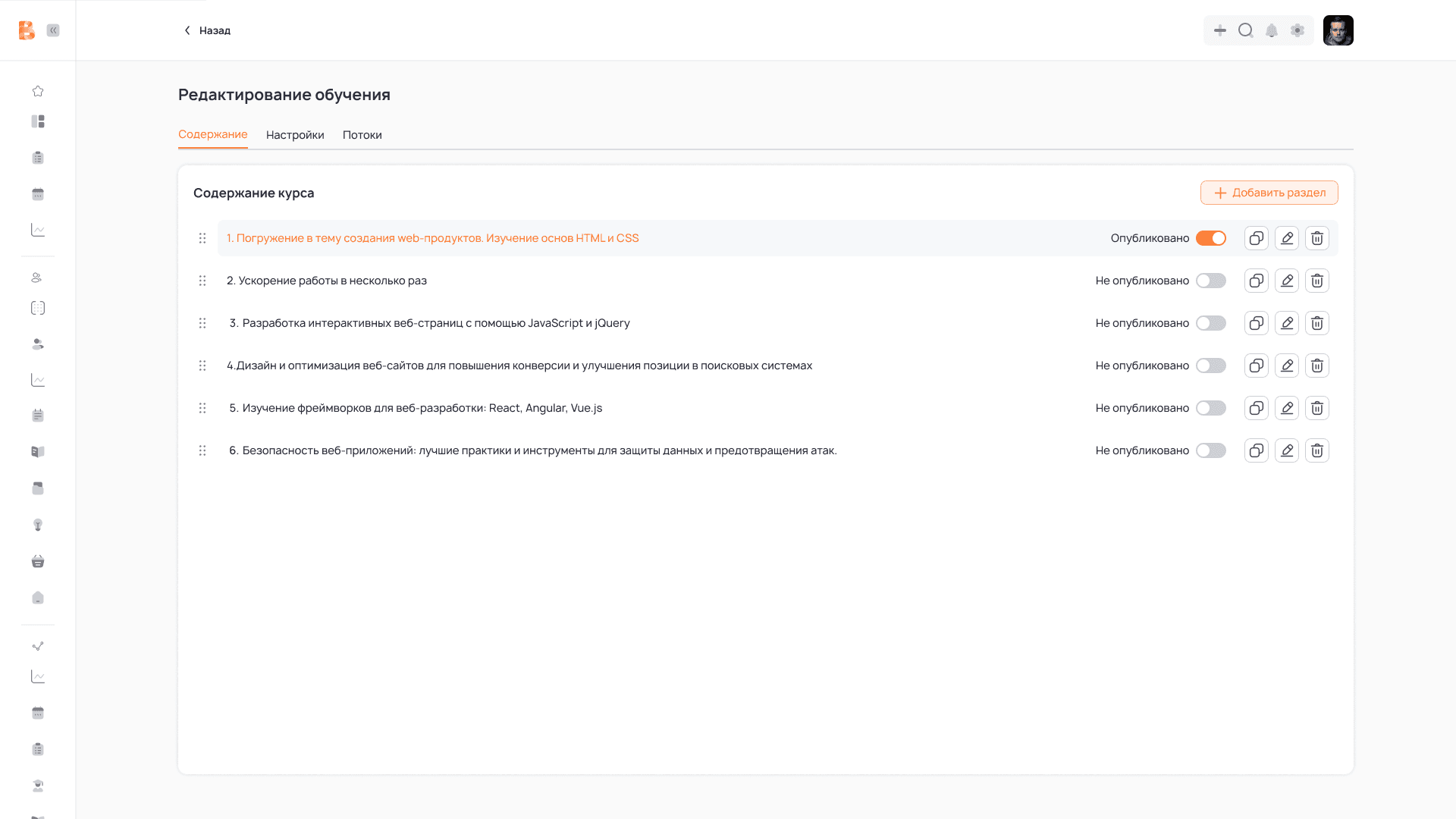 16. Отдельная публикация каждого раздела внутри курса: